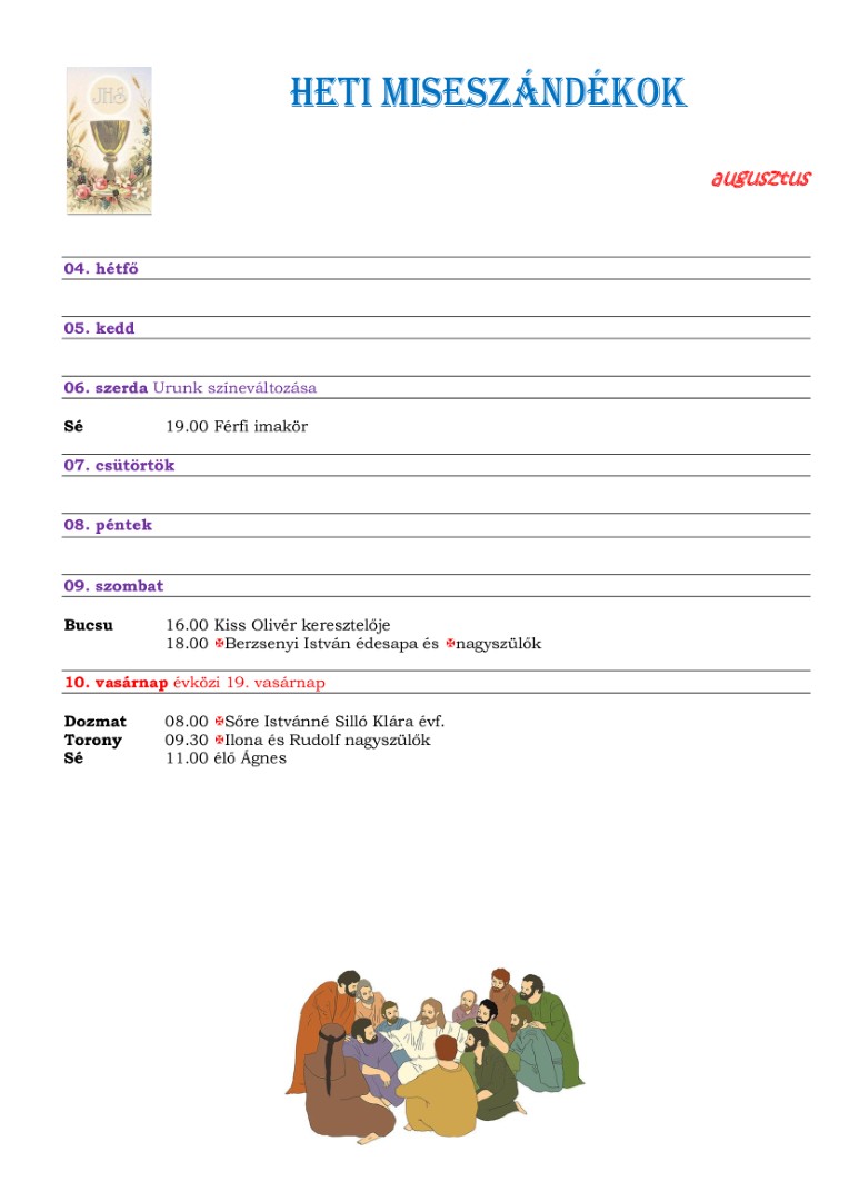 Szentségimádásunkat, augusztus 11-én, hétfőn tartjuk. Délután 2 órakor szentségkitétel és 5 órakor szentségeltétel, majd szentmise. Várjuk a kedves híveket.