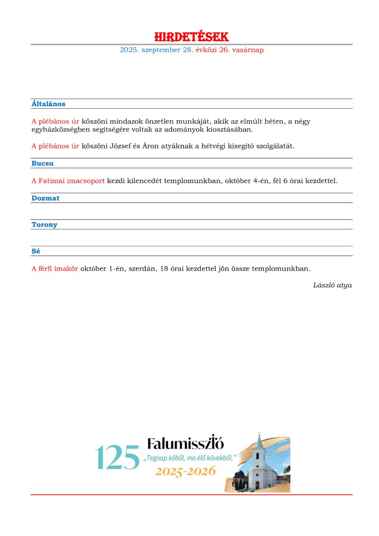 A plébános úr köszöni József és Áron atyáknak a hétvégi kisegítő szolgálatát.
