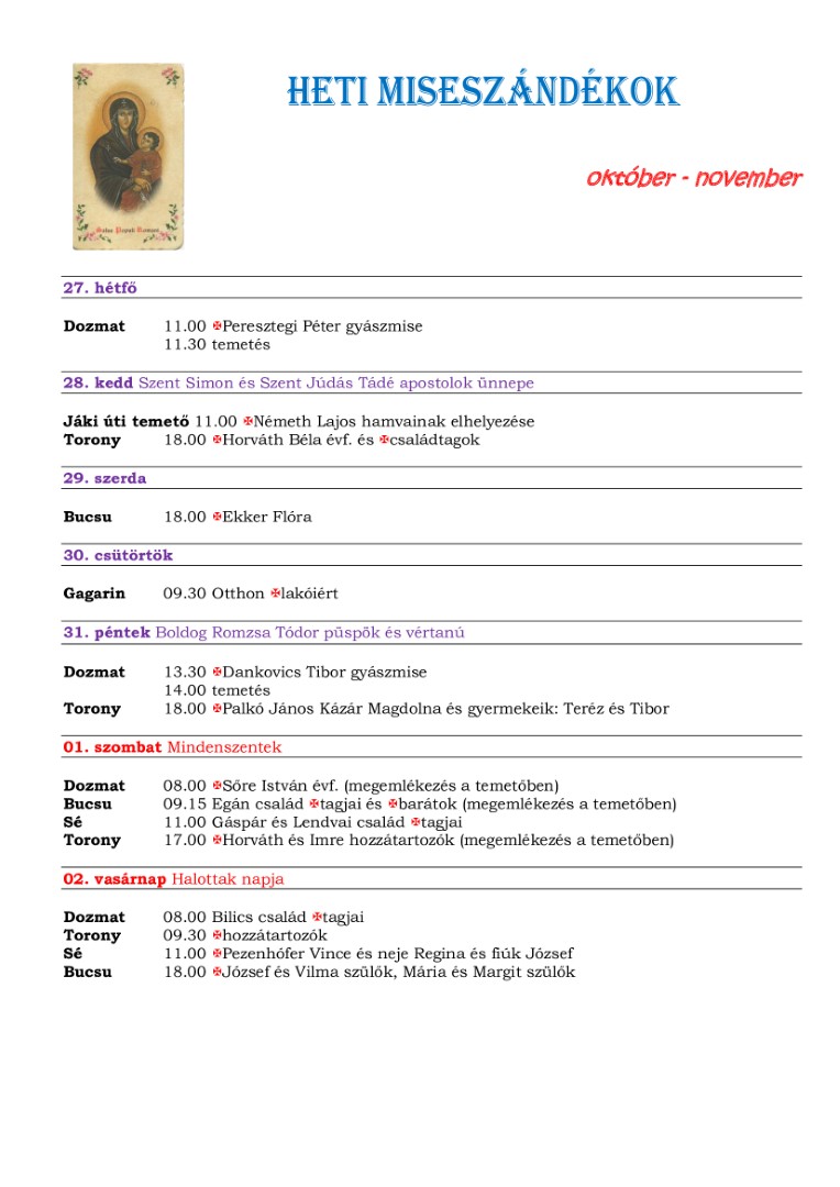 Jövő évi, 1 lapos falinaptár a sekrestyében kapható, 100 forintos áron. Kalendárium és forgatós naptárt lehet rendelni a szentmisék után, november 2-ig.