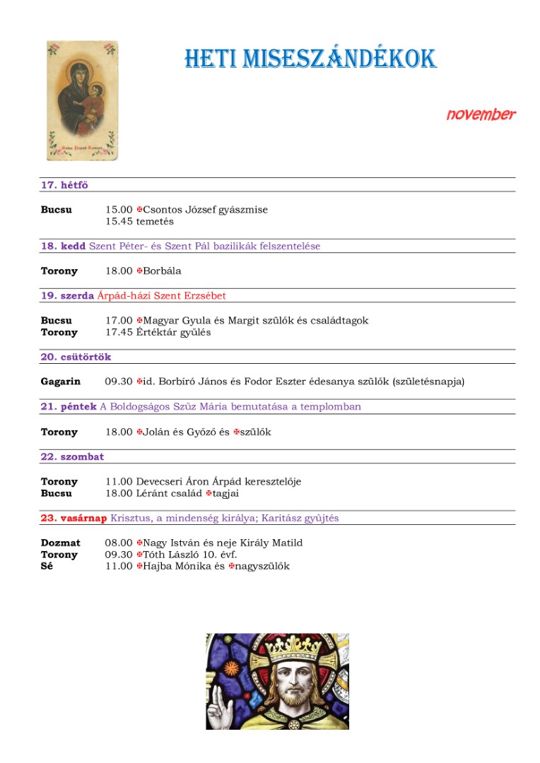 Plébániai hírek: szentségek, naptárak, szándékok, testületi eskü