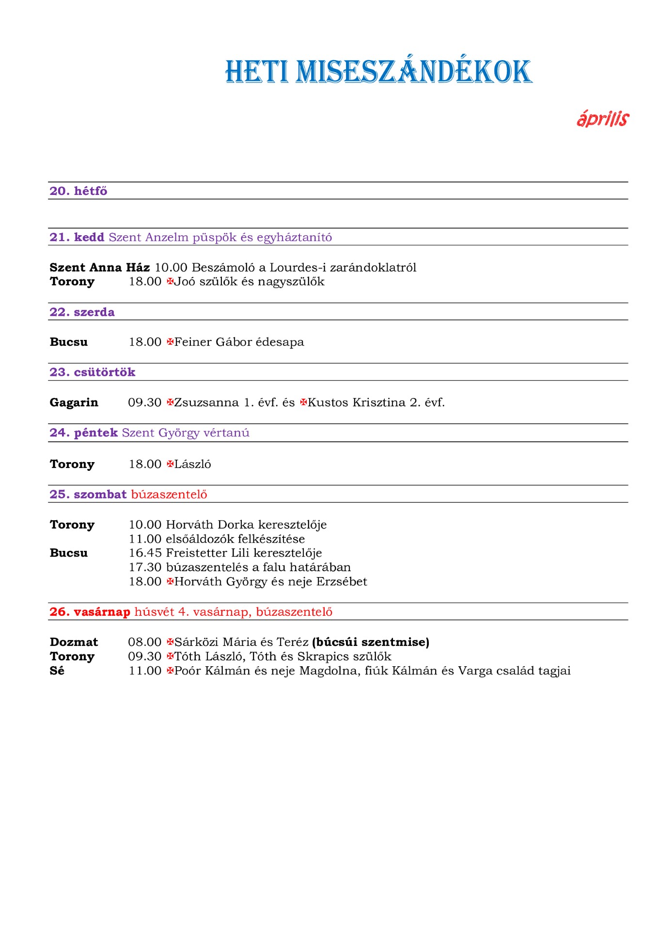 Óvodai beiratkozás időpontjai – 20262026-04-17 0 Heti miserend és események A hét során több szentmise, zarándok beszámoló és búzaszentelés is várja a híveket, valamint keresztelő és elsőáldozási felkészítés is szerepel a programban. Ajánlott bejegyzések2026-04-13Plébániai tájékoztatás: fogadóóra elmaradása és bérmálási események rendjeTovább olvasom2026-04-07Húsvéti hírek és köszönetnyilvánítások a plébániánTovább olvasom2026-03-31Húsvéti készület Toronyban – adomány, szolgálat és új tagok kereséseTovább olvasom2026-03-22Nagyböjti felhívás és közösségi megújulásTovább olvasom2026-03-16Plébániai hirdetések: zarándoklatok, húsvéti készülődés és ünnepi szentmiseTovább olvasom2026-03-09Nagyböjti időszakban gyűjtjük az adományokat a húsvéti díszítésreTovább olvasom2026-03-02Egyházközségi hirdetések – Nagyböjt és tavaszi programokTovább olvasom2026-02-23Nagyböjti hirdetések és zarándoklat MariazellbeTovább olvasom