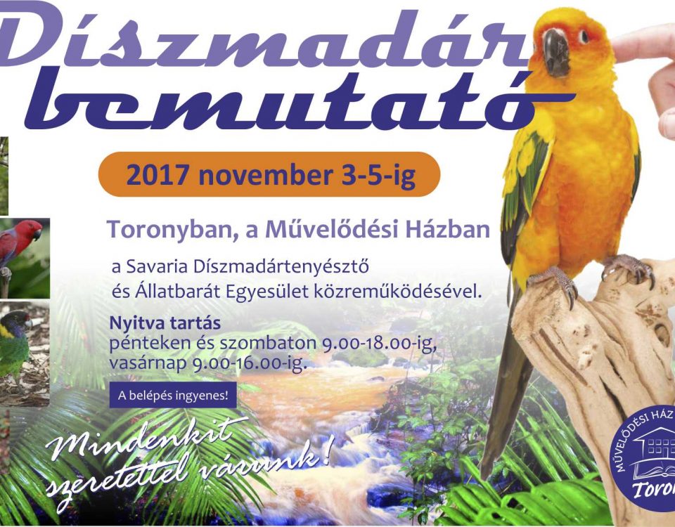 Újra lesz díszmadár bemutató Toronyban, a művelődési házban, ezűttal november 3-án, 4-én és 5-én, azaz a következő hétvégén. Az őszi szünetre időzített remek ingyenes programra várják […]